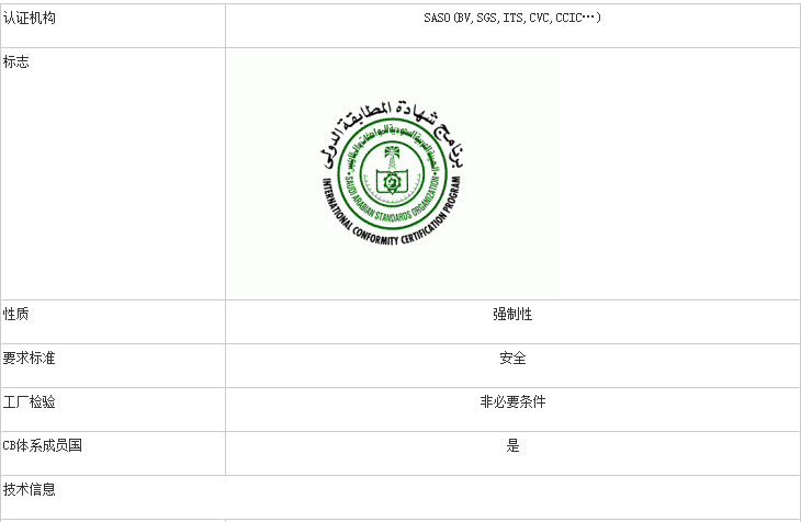 沙特阿拉伯工业及商务部及SASO要求所有SASO认证标准包含的产品在进入沙特海关时有SASO认证证书。没有SASO证书的产品会被沙特 港口海关拒绝入境。 根据沙特阿拉伯标准组织的规定,SASO认证包含所有成人及儿童在住所,办公或娱乐场所使用的产品,所有机动车及零配件,以及建 筑产品。这些产品主要可以分为以下类别: 空调SASO、电池SASO、化妆品SASO、玩具SASO、压缩机SASO、风扇SASO、家用电器SASO、电线电缆SASO、传真机SASO、灯具SASO、光 电源SASO、电梯SASO、发电机SASO、办公用电子电器设备SASO、个人电脑SASO、电源SASO、汽车配件SASO、陶瓷SASO、音响SASO、功放 机SASO、会议系统SASO、调音台SASO 沙特各城市都采用较低电压,分为127伏和220伏(利雅德为235伏)两种,皆为60赫兹; 但在麦加及工业区系采用较高电压,有220伏及380 伏两种,亦为60赫兹. 一般家庭及办公室同时备有110伏(即指127伏)及220伏两种电插座以供不同电压的电器产品使用,一般而言, 冷气机、 洗衣机多用220伏,小家电多用110伏. SASO 认证 ![]() 根据沙特内阁法令No.213,原SASO ICCP已终止,依照内阁法令No6386,一项新的针对出口沙特王国的产品评定方案已获得批准,并将取代原SASO ICCP方案。 这项新的评定方案由沙特商贸部授权实施,旨在确保出口到沙特王国的产品符合相应的沙特王国标准和国际性标准。 新的评定方案要求:所有沙特进口的货物必须附有一张符合性证书(CoC)– 但被禁止或豁免的产品除外 – 以证明产品符合相应 标准(技术标准)要求。证书必须确认这些产品在原产国都在具有相应资质的代理机构监督下,进行了正规的检定。 对于货物的清关和交付,符合性证书(CoC)是强制性的,没有获得证书或者不符合产品符合性评定方案要求的货物都将在目的地 被拒收。 禁止向沙特出口的产品包括:武器、酒类、镇静剂、猪肉、色情资料、酿酒设备、烟火、圣诞树、面具、可视电话、表现动物或 人的玩具、雕像等。 SASO认证标准包含的产品: 根据沙特阿拉伯标准组织的规定,SASO认证包含所有成人及儿童在住所,办公或娱乐场所使用的产品,所有机动车及零配件,以及建 筑产品。这些产品主要可以分为以下类别: 空调、制冷设备、采暖设备 电池 玩具 压缩机及风扇 家用电子电器设备 家用压力锅 电线电缆 传真机 家用开关及断路器 灯具及照明设备 电梯及升降系统 发动机 办公用电子电器设备 个人电脑 电源 电话 机动车及零配件 建筑产品、涂料等 SASO认证的主要程序: 生产商获取SASO认证,向沙特出口产品,需要以下几个步骤: 向咨询公司提出申请, 咨询公司根据产品类别,依照SASO的要求,向企业告知产品认证程序; 企业依照认证程序提交产品样品进行检测,有些产品(如部分机动车及配件产品等)需要进行工厂检查; 经产品检测合格后,企业获得SASO认证证书;如产品经检测不合格,企业将得到一份详细的说明报 产品向沙特出口,货物入关时要出具SASO认证证书,沙特阿拉伯标准组织的技术人员将对证书进行检查;如不能出具SASO证书,产品 将会被拒绝入境或抽样到沙特阿拉伯工业及商务部或沙特阿拉伯标准组织的实验室进行检测,如检测不合格,产品将会被拒绝入境,一切 费用由出口企业承担。 SASO认证的形式 一、装运前符合性验证(Pre-shipment Compliance Verification) 此方式最适于发货非常少的出口商或制造商。每次出货前需申请装船前的验货(PSI)以及装船前的测试(PST)。两者都合格了就可 获得CoC证书。 二、产品注册(Registration) 此方式适于绝大数客户,它的优势在于每次的装船验货(PSI)虽然是必须的,但每批货无须再作装船前测试(PST)。客户通过提交 达标申明,并提供符合进口国及相关国际或国内标准的测试报告,并申明产品已满足进口国的基本要求和国家差异,就可获得登记资格证 书Statement for Registration (SfR)。 三、型式认可(Type Approval Licensing) 这种方式既能节省每次出货前的验货费或测试费,简化重复的申请程序,又能保证交货时间,故为一部分出货较频繁或规模较大,注 重质量及信誉的大公司所青睐。出口商或制造商的产品只有完全符合进出口国强制标准才能获得Statement for Licence(SfL)证书。该证 书有效期为一年,到期前需提交更新厂检报告及缴纳年费并经RLC审核后即可续期。获得SfL证书的产品不再需要每批货都作发货前验货 (PSI),而减为一年为数极少的几次抽验(一般2-3次/年,根据产品状况而定)。 获取符合性认证证书途径 途径1:符合性验证 出口商或供应商在每次出货前申请装船前的现场核查及测试,以确定产品满足沙特技术法规所规定的必要的安全、环境或其他准则。 结果合格后即可获得CoC证书。此途径适用于出口频次不高的情况,如每年出口频次低于三次,推荐采用此途径。 途径2:注册(Registration)及装船前的现场核查 出口商或供应商提供发货样品进行测试,测试合格后该型号(或系列型号)的产品可获得注册证书,注册有效期一年。在该期限内, 注册过的产品在每次出货发运前只需进行现场核查,核查结果合格后即可获得CoC证书。 当注册产品发生变更时,要求对变更后的型号或规格重新进行注册。 该模式的优势在于每次装船前的现场核查虽然是必须的,但每批货无须再作装船前测试。 注:此模式的注册证书,也可依据中国质量认证中心出具的包含有沙特标准差异的IECEE-CB测试报告和证书来获得。 途径3:质量标